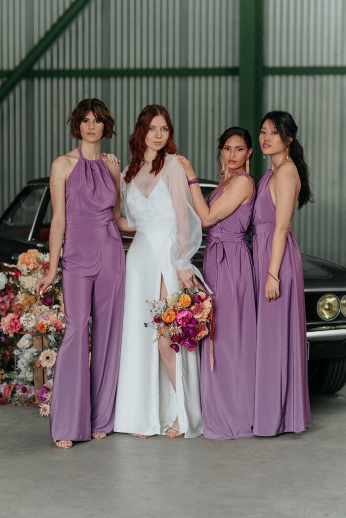 Tenues pour témoins, demoiselles d’honneur et enfants, selon le même principe : prêt-à-porter, personnalisable ou sur-mesure, pour une harmonie sans uniformité.
