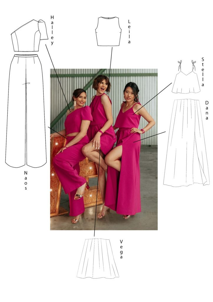 Des hauts et des bas (jupe ou pantalon) qui s’associent et se réunissent pour former une tenue complète : robe ou combi.